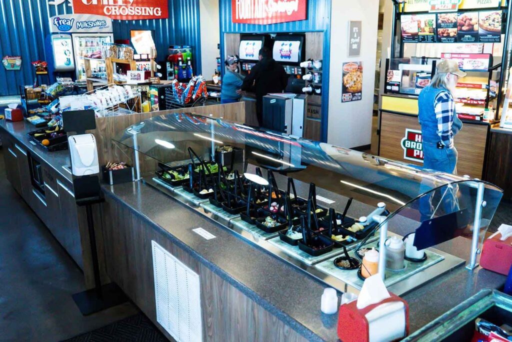 We have been here many times and it continues to be one of our most favorite places to stop, fuel up, get some food, and take a break from driving. It’s rarely crowded and we have never had to wait in line at the diesel lanes. (Can’t comment on the normal fueling islands. Never used them.) There is an enormous parking lot on the property with plenty of room for RVs of all sizes. We’ve rarely seen more than 6 or 8 rigs there at the same time, including truckers. They serve all sorts of hot foot inside and always have a well-stocked supply of snacks, drinks, and beer.